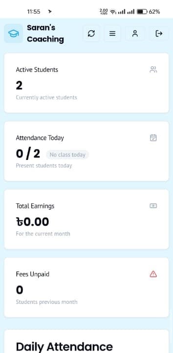 A smart coaching management app that tracks student enrollment, daily attendance, and fees in one place. With real-time updates on earnings and unpaid dues, it makes running your coaching center simple and organized..